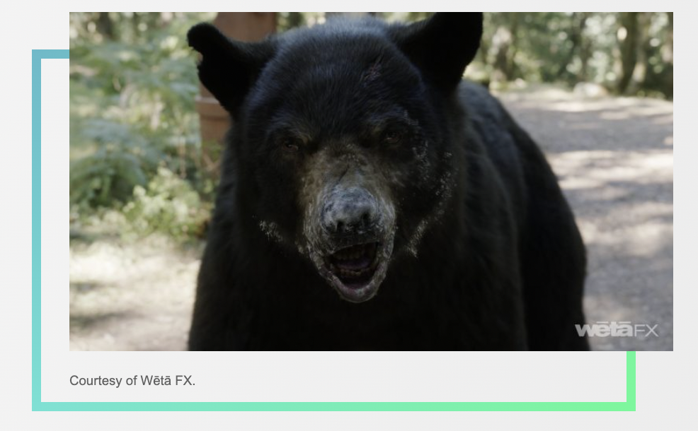 In all her gory glory? It started with the first call we got from Elizabeth Banks. One of her mandates was that if this bear isn’t photoreal, the whole thing falls apart. She was very clear that the bear is not stylized, it’s not a cartoon, it can’t look like bad taxidermy every time she comes on stage.