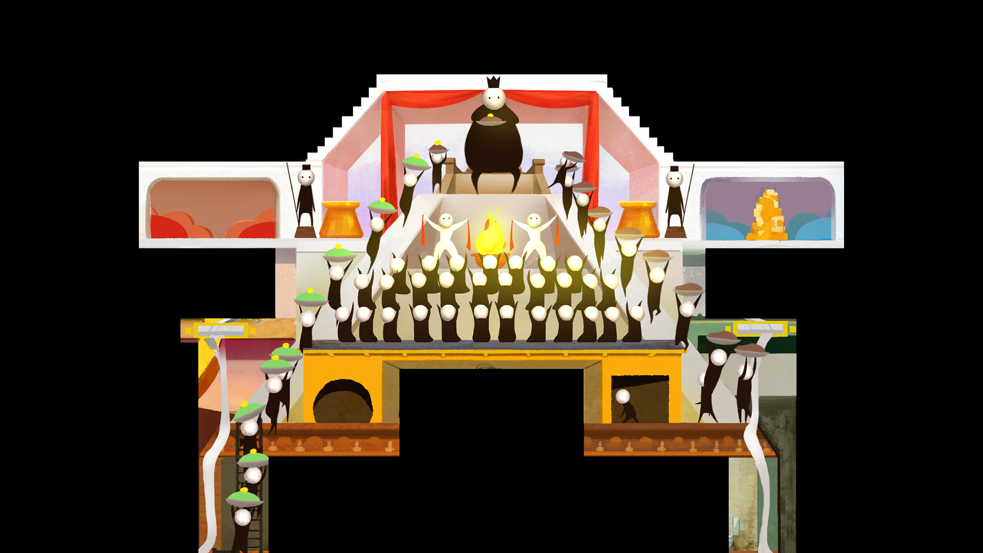 JS: How did the message inspire the medium? How did your goal to essentially chronicle the sweep of human civilization manifest in the film’s design – a static pyramid backdrop teeming with stories enacted by what are essentially stick figures?